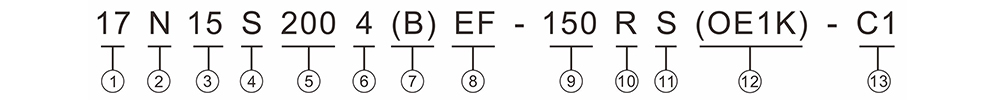 ⑫ Encoder Option | OE = Optical Encoder, 1K=1000PPR(4000CPR) ME = Magnetic Encoder, 1K=1000PPR(4000CPR) P = Manual Knob B = Brake X = Rear Shaft R = Encoder Ready |